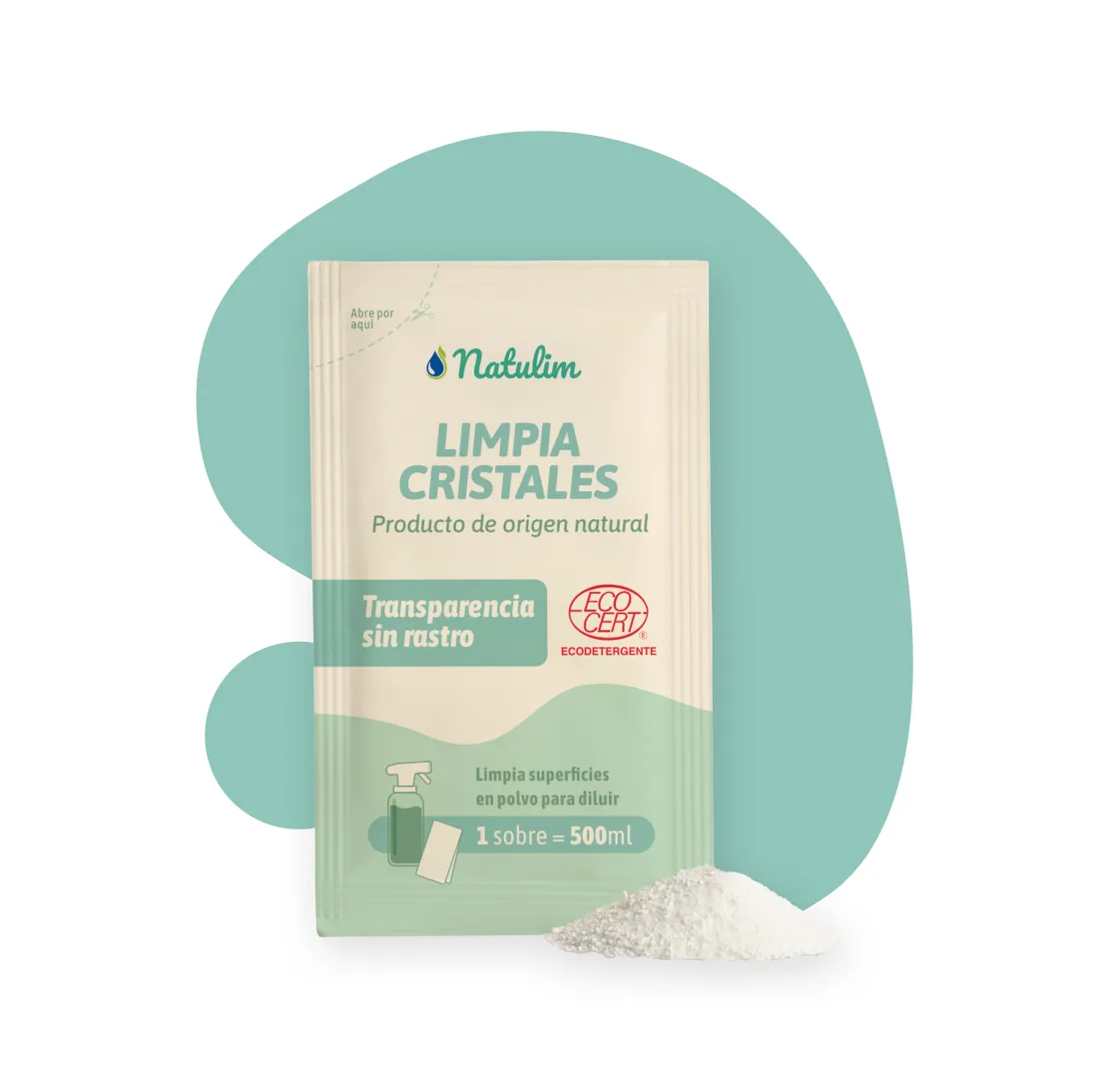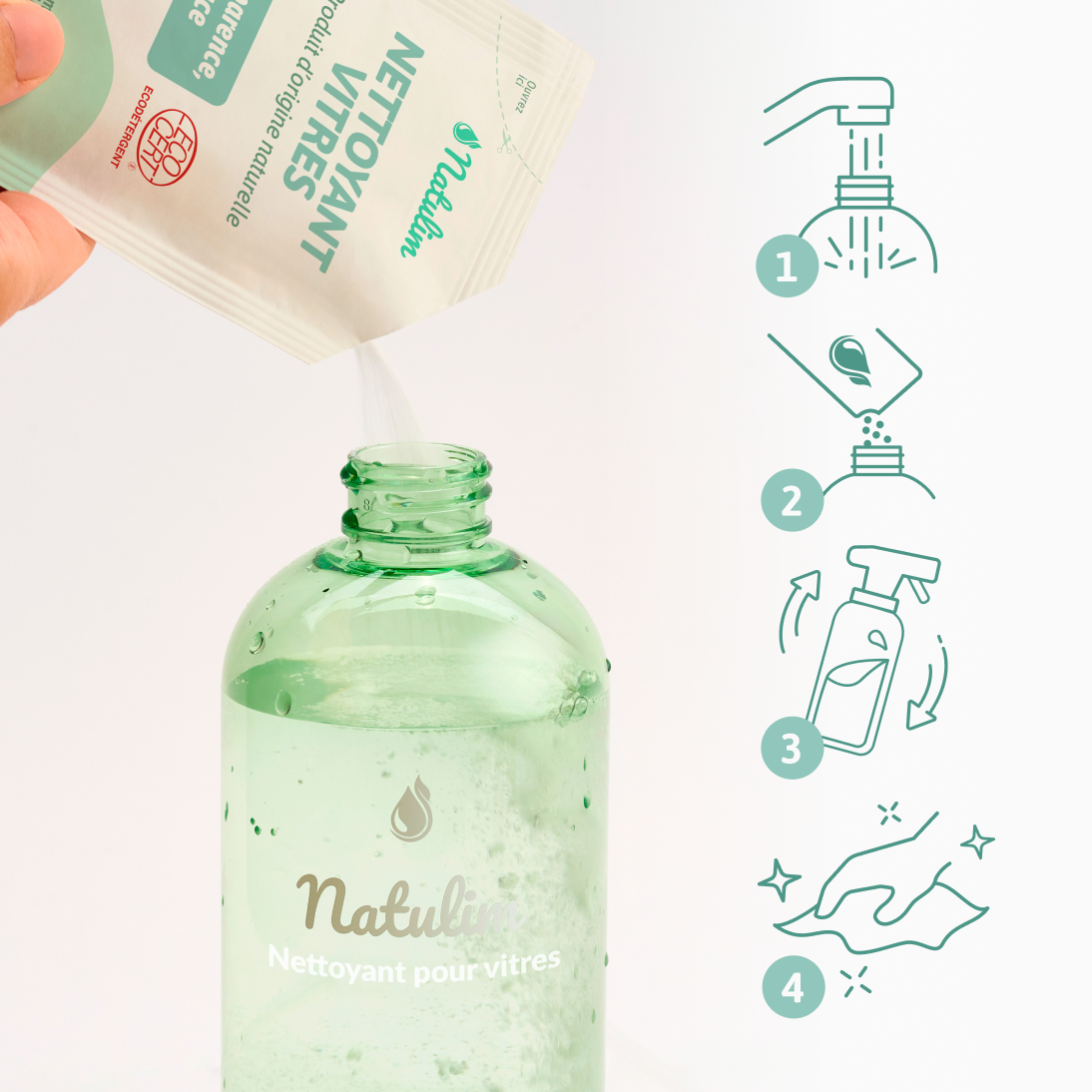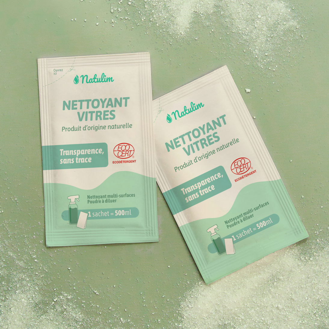 L'actif nettoyant pour vitres se présente sous forme de poudre dans un sachet que vous pouvez verser dans la bouteille avec de l'eau.